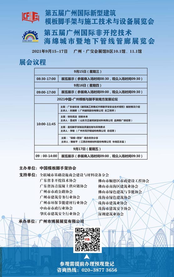 由中國模板腳手架協會主辦,廣州市博展展覽有限公司承辦的第五屆廣州國際新型建筑模板腳手架及施工技術與設備展覽會(以下簡稱廣州模架展)將于9月15-17日在廣州廣交會展館B區舉行。同期舉行第五屆廣州國際非開挖技術海綿城市暨地下管線管廊展覽會。