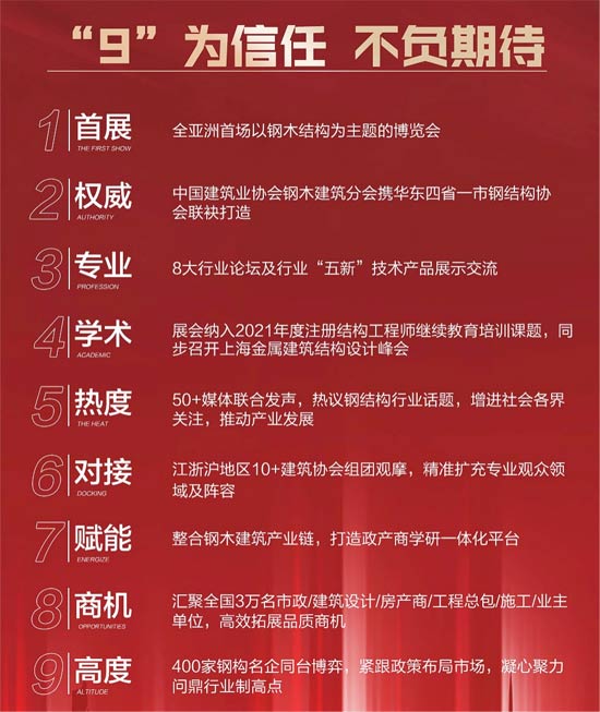 為了促進鋼木建筑產業綠色發展,推進智能制造與新型建筑工業化深度融合,實現建筑業高質量發展要求,抓住鋼木結構建筑推廣的市場機遇,發揮鋼木結構在裝配式建筑中的示范、引領作用,由中國建筑業協會鋼木建筑分會和上海市勘察設計行業協會主辦,上海市金屬結構行業協會協辦,上海展業展覽有限公司承辦的“2021亞洲金屬建筑設計與產業博覽會(MBE)”將以設計為綱,材料系統為領的辦會方向,全力打造亞洲金屬建筑產業一站式解決方案平臺。同期還將舉辦多場行業高質量論壇和技術研討會議,吸引亞太多個國家及地區的市政單位、設計研究院、建筑設計/咨詢公司、投資商/開發商/業主、工程建設/施工單位、建筑協會/學會、經銷代理商和鋼木建筑裝備與材料行業的專業人士到場參會參展,探討行業最新政策導向、科研成果和實踐經驗,共促鋼木建筑產業發展!