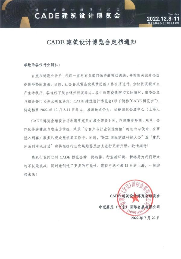 自發(fā)布延期公告后,我們一直與有關(guān)部門(mén)保持著密切溝通,并時(shí)刻關(guān)注著全國(guó)疫情形勢(shì)的發(fā)展。目前,社會(huì)各地常態(tài)化疫情防控工作有序進(jìn)行,加快恢復(fù)城市生產(chǎn)生活秩序,各地線(xiàn)下展會(huì)逐步恢復(fù)舉辦。鑒于近期疫情防控實(shí)際情況,組委會(huì)經(jīng)與相關(guān)部門(mén)協(xié)調(diào)及研究決定: CADE建筑設(shè)計(jì)博覽會(huì)(以下簡(jiǎn)稱(chēng)“CADE博覽會(huì)”),將定檔至2022年12月8-11日舉辦,展出地點(diǎn)仍為:虹橋國(guó)家會(huì)展中心(上海)。