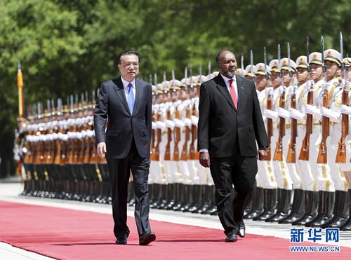 5月27日,國務院總理李克強在北京人民大會堂同瓦努阿圖總理薩爾維舉行會談。這是會談前,李克強在人民大會堂東門外廣場為薩爾維舉行歡迎儀式。 新華社記者 丁海濤 攝