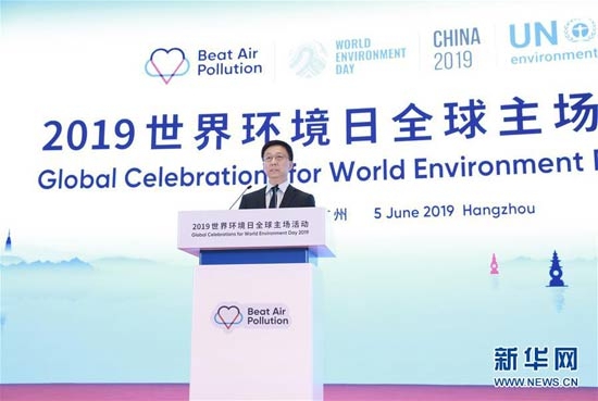 6月5日,中共中央政治局常委、國務院副總理韓正出席在浙江省杭州市舉行的2019年世界環境日全球主場活動,宣讀習近平主席的賀信并發表主旨講話。 新華社記者 龐興雷 攝
