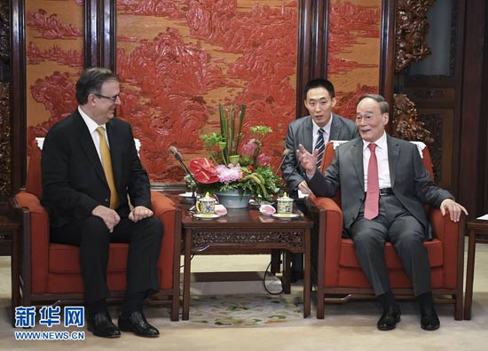 7月1日,國家副主席王岐山在北京中南海會見墨西哥外長埃布拉德。 新華社記者 殷博古 攝