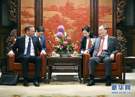 7月19日,國家副主席王岐山在北京中南海會見法國總統外事顧問博納。 新華社記者燕雁攝