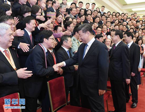 9月10日,黨和國家領導人習近平、李克強、王滬寧等在北京人民大會堂會見慶祝2019年教師節暨全國教育系統先進集體和先進個人表彰大會受表彰代表。 新華社記者 申宏 攝