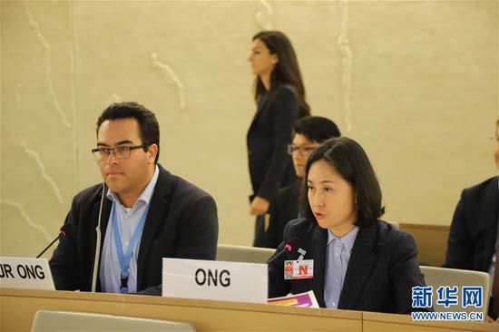9月11日,在瑞士日內瓦,中國香港各界婦女聯合協進會主席何超瓊(前右)在聯合國人權理事會第42次會議期間發言。 繼當天早些時候在聯合國人權理事會第42次會議一般性辯論環節發言后,何超瓊11日下午再次在“真相、正義、賠償與保證不再發生”議題下發言指出,部分自詡的香港“自由斗士”偽善且使用雙重標準。 新華社記者陳俊俠攝