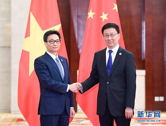 9月20日,中共中央政治局常委、國務(wù)院副總理韓正在廣西南寧會(huì)見出席第十六屆中國—東盟博覽會(huì)和中國—東盟商務(wù)與投資峰會(huì)的越南副總理武德?lián)?新華社記者 申宏 攝