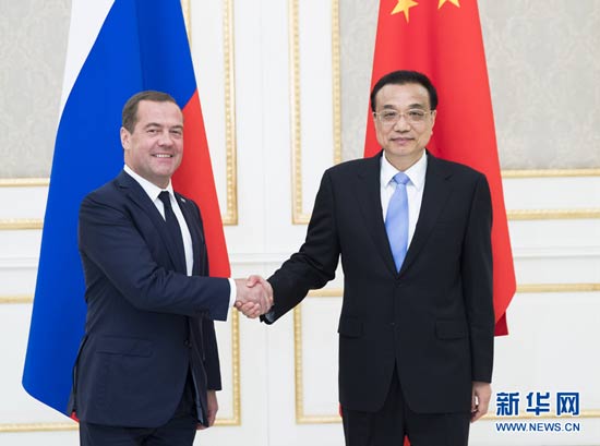 當地時間11月1日晚,國務院總理李克強在塔什干會見出席上海合作組織成員國總理會的俄羅斯總理梅德韋杰夫。 新華社記者 劉衛兵 攝