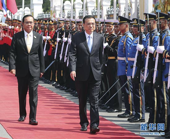 當地時間11月5日上午,國務院總理李克強在曼谷總理府同泰國總理巴育舉行會談。這是會談前,巴育在總理府前廣場為李克強舉行隆重歡迎儀式。 新華社記者姚大偉攝
