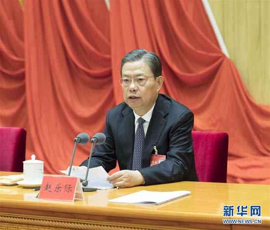 中共中央政治局常委、中央紀律檢查委員會書記趙樂際代表中央紀律檢查委員會常務委員會作題為《堅持和完善黨和國家監督體系為全面建成小康社會提供堅強保障》的工作報告。 新華社記者 王曄 攝