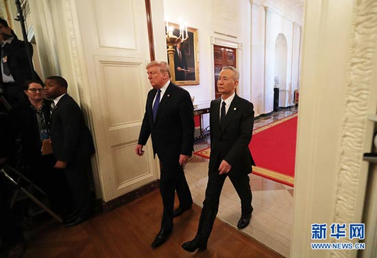 當地時間1月15日上午,中共中央政治局委員、國務院副總理、中美全面經濟對話中方牽頭人劉鶴(右)與美國總統特朗普抵達華盛頓白宮東廳,準備參加中美第一階段經貿協議簽署儀式。 新華社記者 王迎 攝