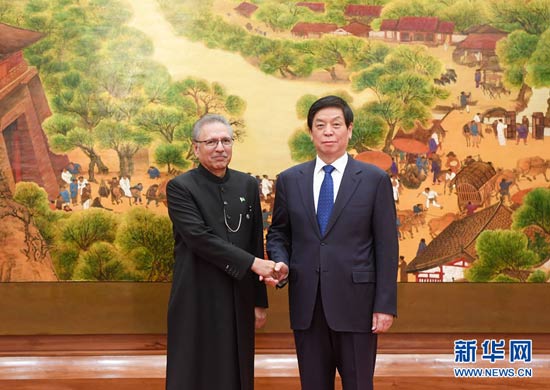3月17日,全國人大常委會委員長栗戰書在北京人民大會堂會見巴基斯坦總統阿爾維。 新華社記者 申宏 攝