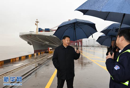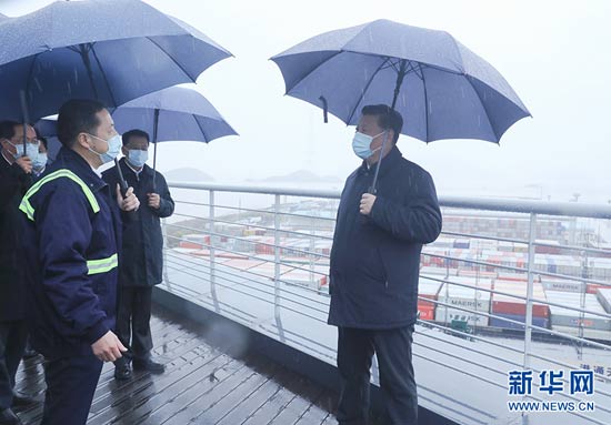 3月29日,中共中央總書記、國家主席、中央軍委主席習近平在浙江考察調研。這是習近平在寧波舟山港穿山港區碼頭了解港口復工復產情況。 新華社記者 申宏 攝
