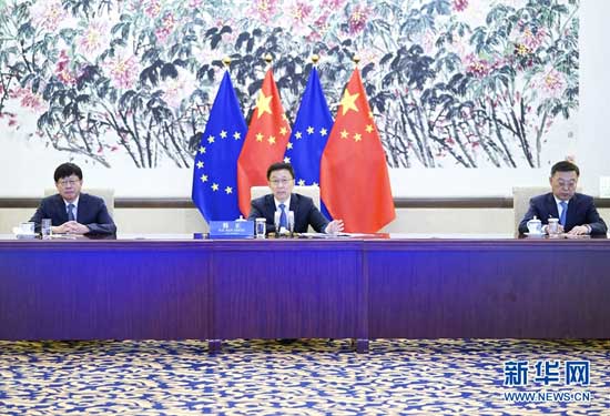 7月29日,中共中央政治局常委、國(guó)務(wù)院副總理韓正在北京同歐盟委員會(huì)第一副主席蒂默曼斯舉行視頻會(huì)見。 新華社記者 燕雁