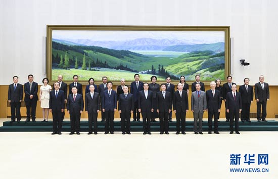 8月19日,中共中央政治局常委、國務(wù)院總理李克強在北京向新聘任的國務(wù)院參事和中央文史研究館館員頒發(fā)聘書。這是李克強與新聘任的國務(wù)院參事和中央文史研究館館員等合影。新華社記者 謝環(huán)馳 攝