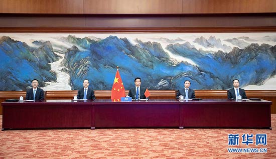 8月19日,全國人大常委會委員長栗戰書在北京人民大會堂出席第五次世界議長大會視頻會議。 新華社記者 李濤 攝