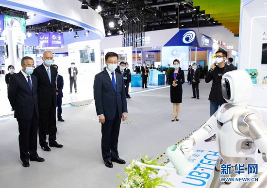 9月4日,中共中央政治局常委、國務院副總理韓正在北京出席2020年中國國際服務貿易交易會全球服務貿易峰會并宣布服貿會開幕。這是峰會開始前,韓正視察服貿會展館。 新華社記者 黃敬文 攝