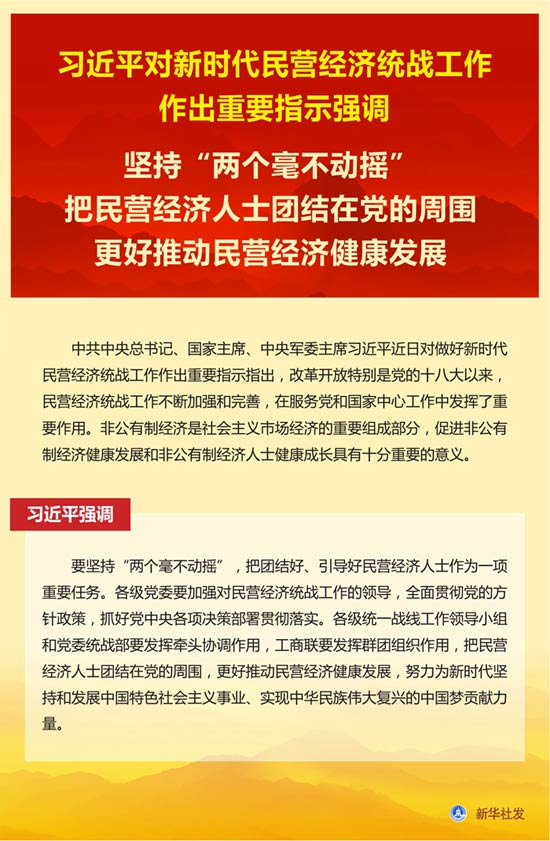 習近平強調,要堅持“兩個毫不動搖”,把團結好、引導好民營經濟人士作為一項重要任務。各級黨委要加強對民營經濟統戰工作的領導,全面貫徹黨的方針政策,抓好黨中央各項決策部署貫徹落實。各級統一戰線工作領導小組和黨委統戰部要發揮牽頭協調作用,工商聯要發揮群團組織作用,把民營經濟人士團結在黨的周圍,更好推動民營經濟健康發展,努力為新時代堅持和發展中國特色社會主義事業、實現中華民族偉大復興的中國夢貢獻力量。