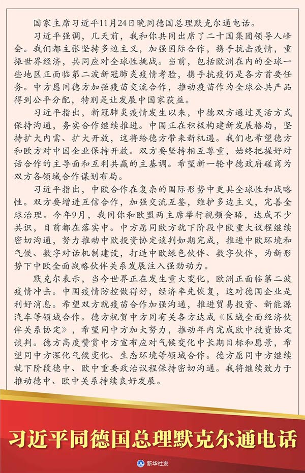 習近平強調,幾天前,我和你共同出席了二十國集團領導人峰會。我們都主張堅持多邊主義,加強國際合作,攜手抗擊疫情,重振世界經濟,共同應對全球性挑戰。當前,包括歐洲在內的全球一些地區正面臨第二波新冠肺炎疫情考驗,攜手抗疫仍是各方首要任務。中方愿同德方加強疫苗交流合作,推動疫苗作為全球公共產品得到公平分配,特別是讓發展中國家獲益。