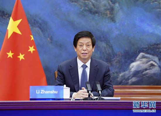 3月17日,全國(guó)人大常委會(huì)委員長(zhǎng)栗戰(zhàn)書在北京人民大會(huì)堂以視頻方式同哈薩克斯坦議會(huì)下院議長(zhǎng)尼格馬圖林舉行會(huì)談。新華社記者 張領(lǐng) 攝