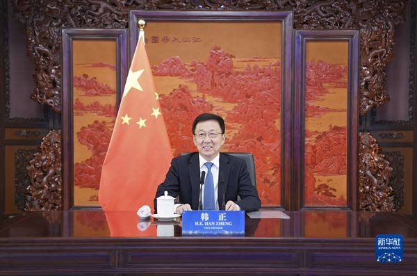 9月7日,中共中央政治局常委、國務(wù)院副總理韓正在北京通過視頻方式會見來華訪問的聯(lián)合國氣候變化格拉斯哥大會候任主席夏爾馬。新華社記者 張領(lǐng) 攝