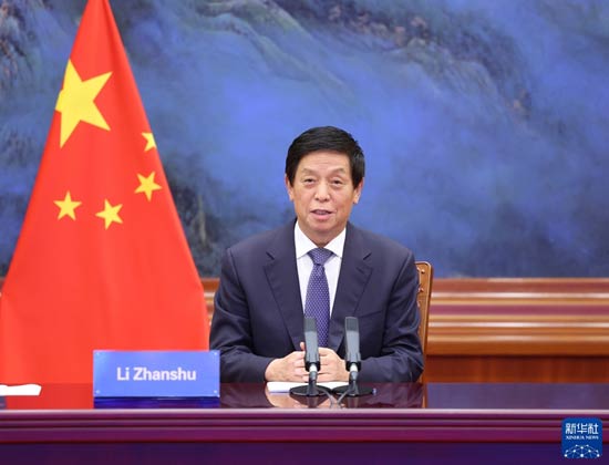9月15日,全國人大常委會委員長栗戰(zhàn)書在北京人民大會堂以視頻方式同巴林國民議會議長兼眾議長扎伊納勒舉行會談。