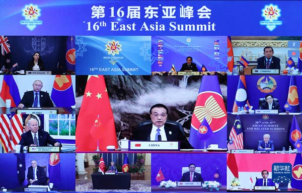 10月27日晚,國(guó)務(wù)院總理李克強(qiáng)在北京人民大會(huì)堂出席第16屆東亞峰會(huì)。會(huì)議以視頻形式舉行。新華社記者 姚大偉 攝