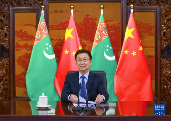11月22日,中共中央政治局常委、國務院副總理、中土合作委員會中方主席韓正在北京以視頻方式同土庫曼斯坦副總理謝·別爾德穆哈梅多夫共同主持中土合作委員會第五次會議。新華社記者 丁林 攝