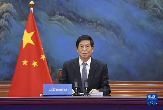 12月7日,全國人大常委會委員長栗戰(zhàn)書在北京人民大會堂以視頻方式同奧地利國民議會議長索博特卡舉行會談。新華社記者 張領(lǐng) 攝