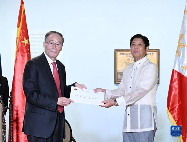 6月30日,應菲律賓政府邀請,習近平主席特別代表、國家副主席王岐山在菲律賓首都馬尼拉出席菲律賓新任總統馬科斯就職儀式并同其會見。會見時,王岐山向馬科斯轉交習近平主席賀信,并轉達習近平主席對馬科斯總統的親切問候和良好祝愿。新華社記者 張領 攝