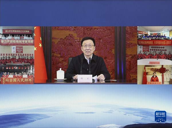 1月18日,國務院副總理韓正在北京通過衛星視頻連線,向我國正在極地和大洋執行任務的科學考察隊員們致以親切的慰問和新春的祝福。