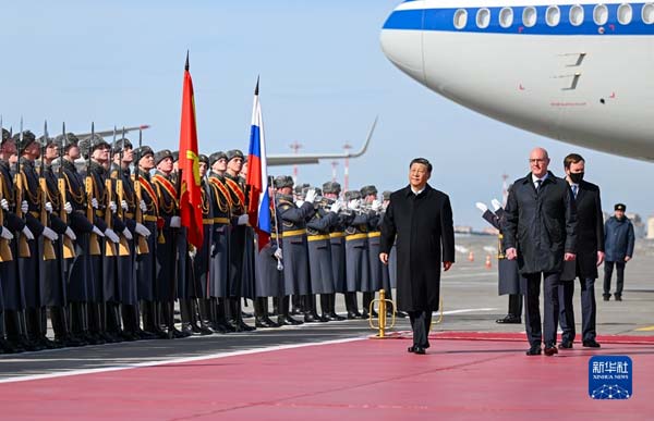 當地時間3月20日,國家主席習近平乘專機抵達莫斯科,應俄羅斯總統普京邀請,對俄羅斯進行國事訪問。下午1時許,習近平乘坐的專機抵達莫斯科伏努科沃專機機場。習近平步出艙門時,俄羅斯副總理切爾內申科等政府高級官員在舷梯旁熱情迎接。俄方在機場舉行隆重迎賓儀式。軍樂團奏中俄兩國國歌。這是習近平檢閱俄羅斯三軍儀仗隊并觀看分列式。