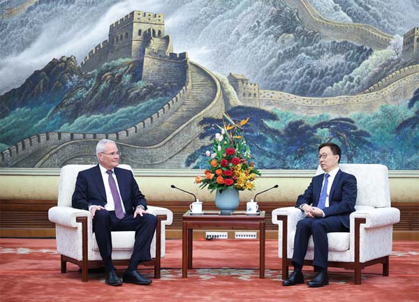 3月25日,國家副主席韓正在北京會見美國??松梨诠径麻L兼首席執行官伍德倫。