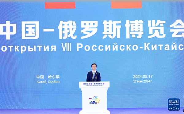 5月17日,國家副主席韓正在哈爾濱同俄羅斯總統(tǒng)普京共同出席第八屆中俄博覽會開幕式,宣讀習近平主席賀信并致辭。