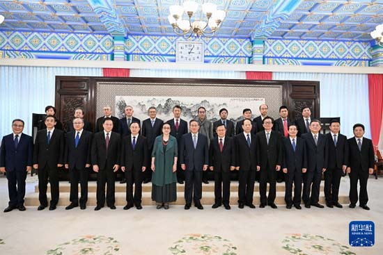 6月26日,中共中央政治局常委、國務(wù)院總理李強向新聘任的國務(wù)院參事劉實、常繼樂、李卓彬、尹中立、盧琦、張平、劉衛(wèi)東和中央文史研究館館員孫曉云、張平、趙汀陽、榮新江、萬建中頒發(fā)聘書。這是頒發(fā)聘書后,李強同大家合影留念。新華社記者 饒愛民 攝