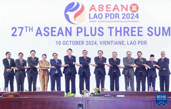 當(dāng)?shù)貢r(shí)間10月10日,國(guó)務(wù)院總理李強(qiáng)在老撾萬(wàn)象出席第27次東盟與中日韓(10+3)領(lǐng)導(dǎo)人會(huì)議。這是會(huì)前集體合影。