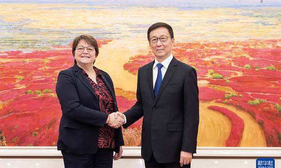 12月11日,國家副主席韓正在北京會見第六屆中法二軌高級別對話會議法方代表團(tuán)。這是韓正同法方代表團(tuán)主席博納爾握手。