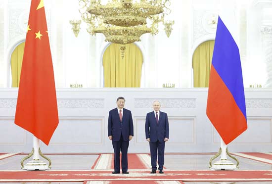 當地時間5月8日上午,俄羅斯總統普京同中國國家主席習近平在莫斯科克里姆林宮舉行會談。在莊嚴的迎賓曲中,習近平和普京分別從喬治大廳兩側沿紅地毯健步走到大廳中央。