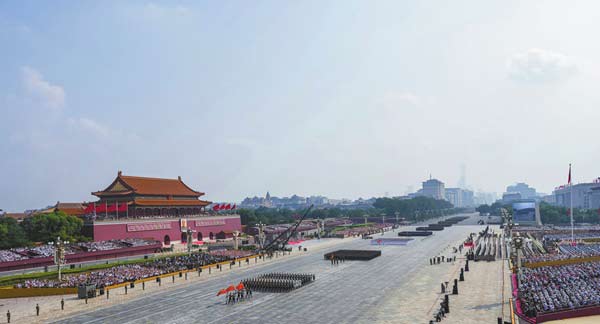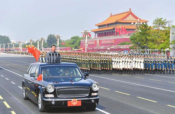 雄壯的軍樂聲中,習近平乘車沿著寬闊的長安街,依次檢閱13個徒步方隊、1個戰旗方隊、22個裝備方隊。受閱部隊軍容嚴整、意氣風發,鐵甲戰車整齊列陣、威風凜凜。這是人民軍隊奮進建軍百年的嶄新亮相,這是中華民族捍衛世界和平的堅定宣示。