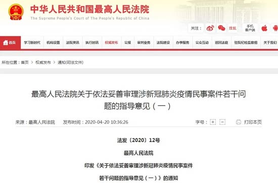 4月20日,最高人民法院公布《關(guān)于依法妥善審理涉新冠肺炎疫情民事案件若干問(wèn)題的指導(dǎo)意見(jiàn)(一)》?!兑庖?jiàn)》共十條,涉及充分發(fā)揮司法服務(wù)保障,準(zhǔn)確適用不可抗力規(guī)則,依法妥善審理合同糾紛、勞動(dòng)爭(zhēng)議等案件,適用懲罰性賠償,訴訟時(shí)效中止和訴訟期間順延,加大司法救助與企業(yè)幫扶等內(nèi)容。